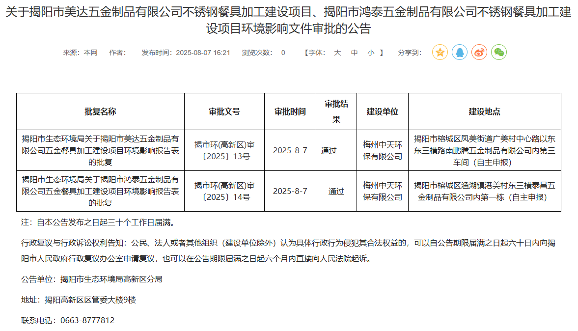 2025年8月7日,揭陽市生態環境局高新區分局就2個不銹鋼餐具加工建設項目環境影響報告表作出審批通過并對外進行公告,公告期:自本公告發布之日起三十個工作日屆滿。