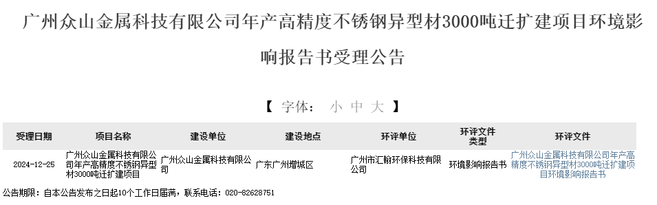 2024年12月25日,廣州市生態環境局受理廣州眾山金屬科技有限公司年產高精度不銹鋼異型材3000噸遷擴建項目環境影響報告書并對外進行公告,公告期:10個工作日。