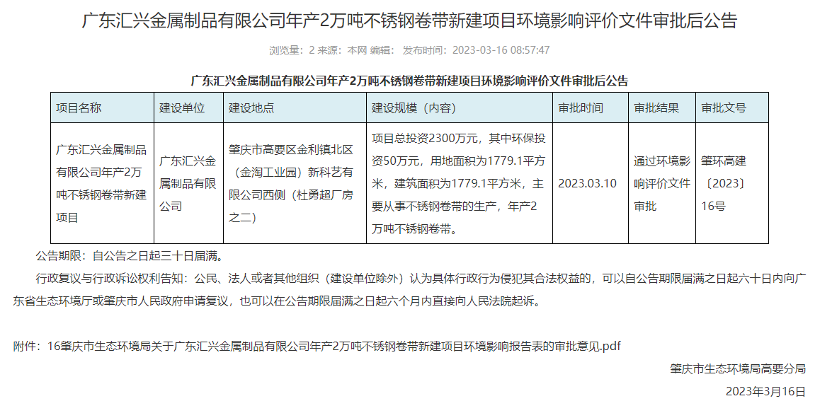 3月16日,肇慶市生態環境局高要分局就東匯興金屬制品有限公司年產2萬噸不銹鋼卷帶新建項目環境影響報告表作出審批意見并對外進行公告,公告期限:自公告之日起三十日屆滿。